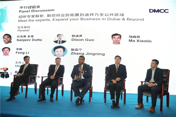 马晓霖教授应邀参加讨论会环节,与DMCC大宗商品部总监Sanjeev Dutta、迪拜工商部中国代表Daniel Sellers、律盾国际法律联盟理事长张晶宁、盈天(迪拜)国际CEO Justin Li围绕“一带一路”中国和迪拜合作前景、中国投资迪拜34亿美元项目以及迪拜2020世博会机遇等问题展开讨论。