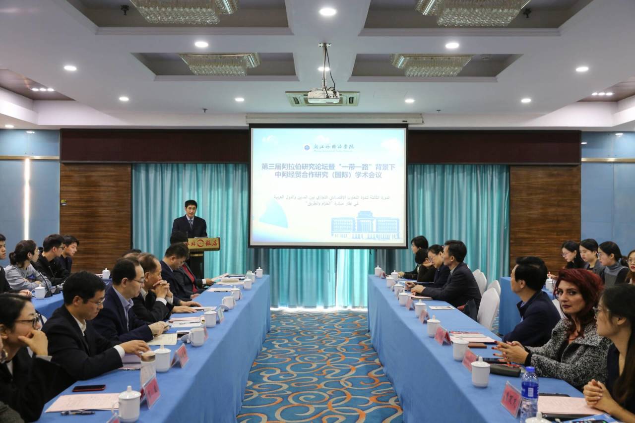 和中国中东学会共同主办,浙外东语学院和阿拉伯研究中心承办,来自中国、黎巴嫩、埃及、叙利亚等国家和地区的专家、学者、外交官围绕“一带一路”背景下中国与阿拉伯国家经贸合作的现状与未来展开研讨 。中国中东问题特使、中国前驻埃及和沙特大使吴思科,中国现代国际关系研究院原副院长、宁夏大学中国阿拉伯研究院院长李绍先,上海外国语大学丝路战略研究所所长、《新丝路学刊》主编马丽蓉等嘉宾分别以《“一带一路”:建设为中阿发展注入新动力》、《叙利亚局势的最新变化及重建》和《中国与沙特共建“一带一路”的成就及其意义》等为题作了主旨发言。与会专家、学者踊跃发言,发表各自观点,交流互动热烈。