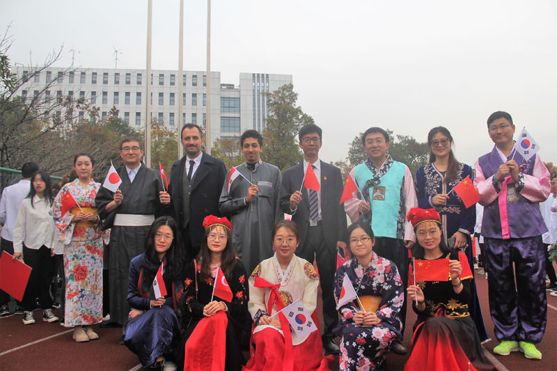 运动会开幕之初,学校各领导纷纷致辞。接下来是方队表演环节。东语学院的领导、师生们组成代表方队迈着整齐步伐走向主席台,在绚丽鲜花中拼出鲜红醒目的数字“70”。随后肉漫屋