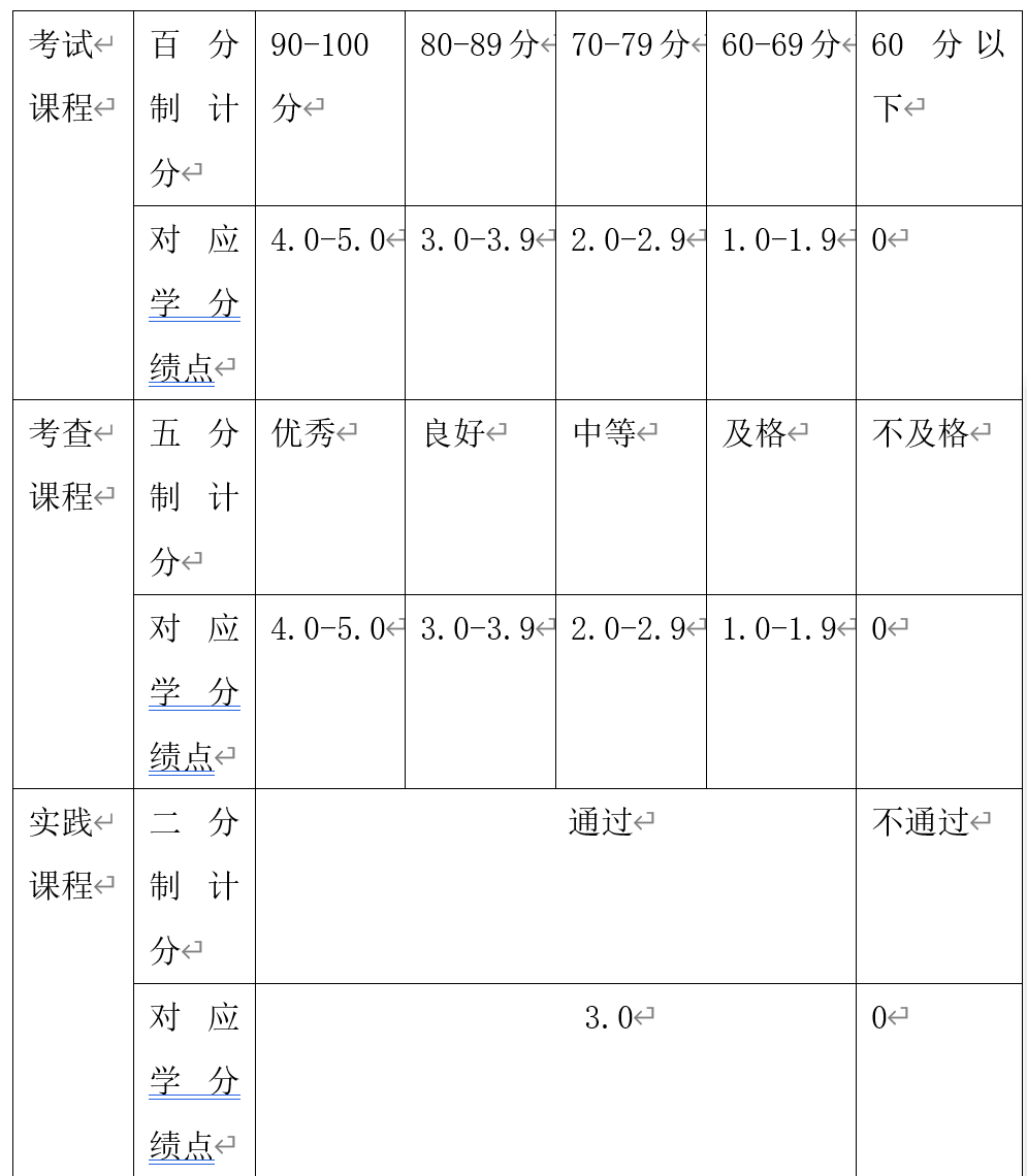 学生考核成绩与学分绩点的对应关系如下: