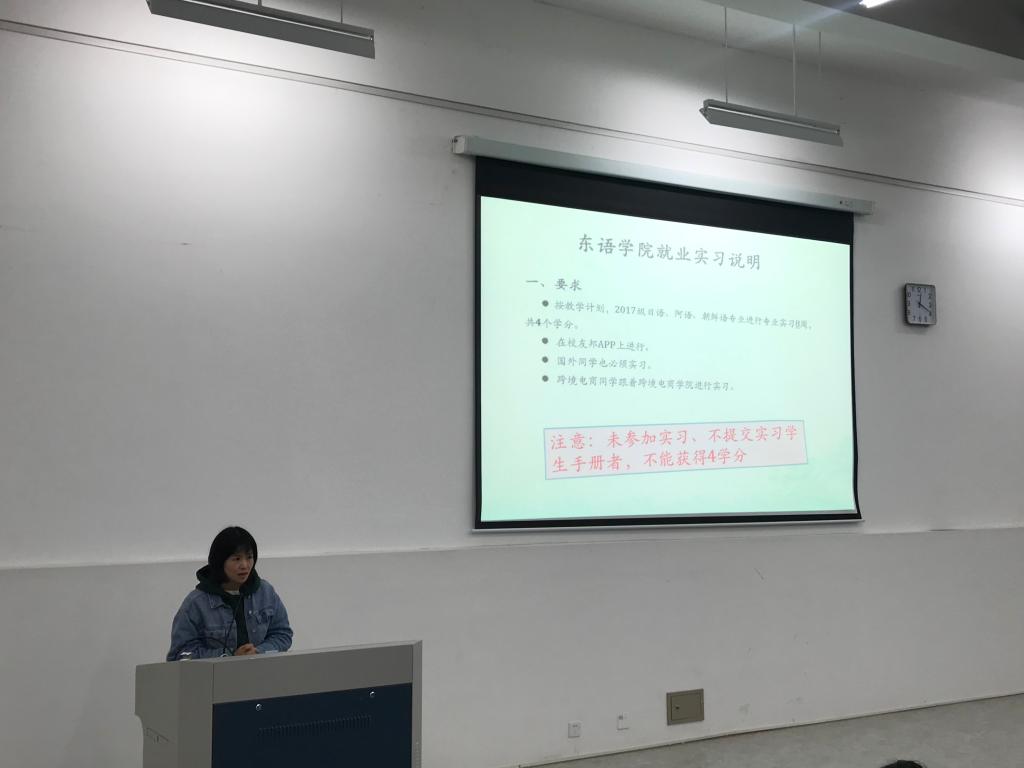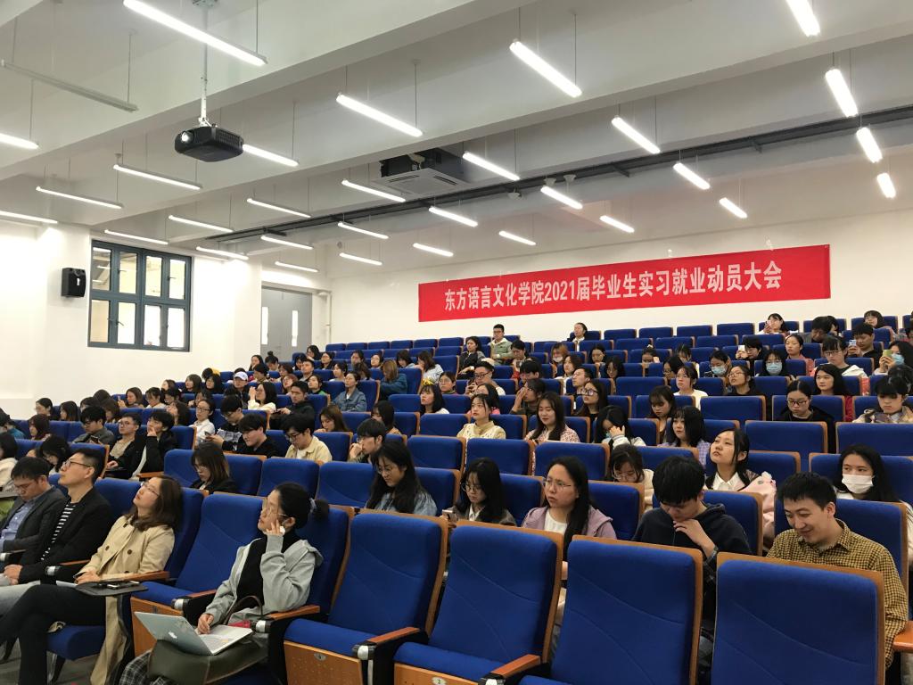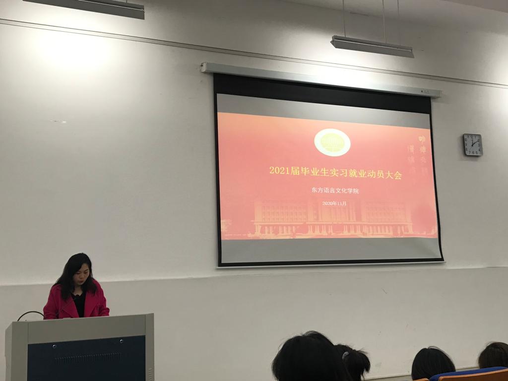 2020年毕业生就业工作已经拉开序幕,为了让毕业生尽早了解就业形势和用人单位需求,进一步拓宽就业渠道,匹配学生就业意愿,提高学生就业质量,11月5日中午12点,东语学院在融D108召开了2021届毕业生就业实习动员大会。学院副院长陈新妍、党总支副书记方盼、学工办辅导员杜茜、办公室教务秘书何琰老师、各系主任及毕业班班主任出席本次大会。