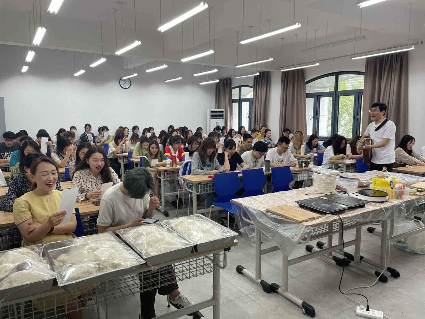 2. 由金洙京老师教唱韩文歌曲“紫菜包饭”,同学们纷纷投入到了学习歌曲的热情中去,伴随着金老师的吉他声一起合唱,现场气氛热烈。