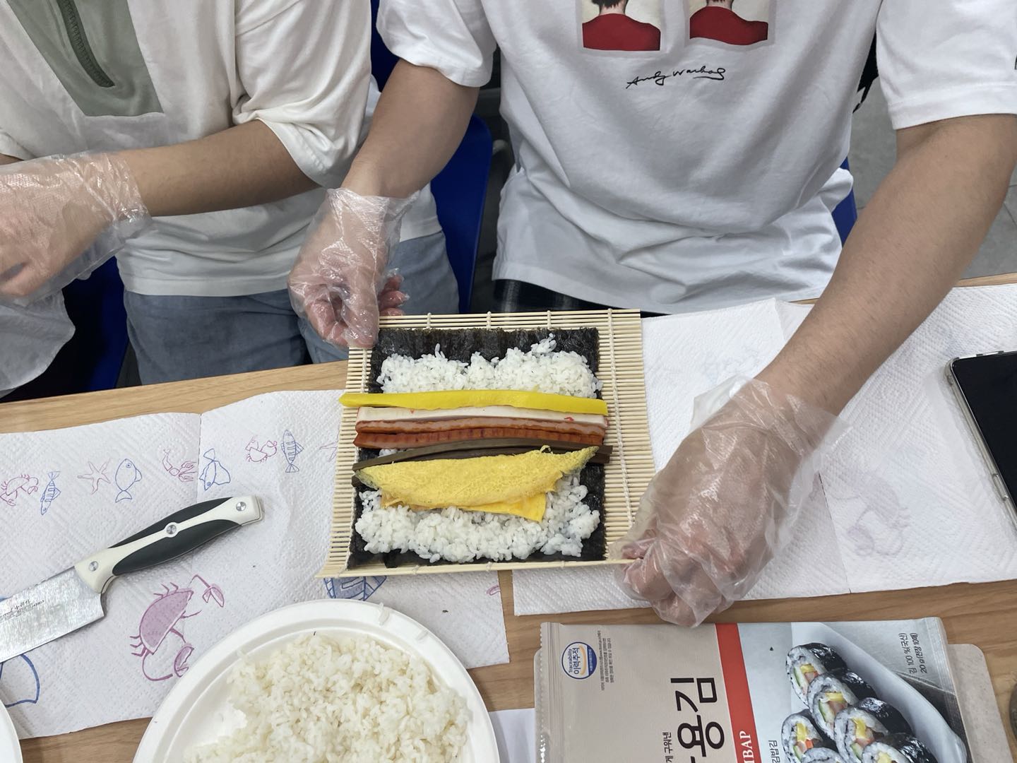 3. 接下来就是最受期待的实操环节啦。在此过程中,两个年级的同学们互帮互助,为对方传递所需食材,共同合作制作美食。大家制作出来的紫菜包饭色香味俱全,同学们完成后纷纷将制作的紫菜包饭分享各位老师和小伙伴们,大家都赞不绝口,制作品尝美食的同时也增进了同学间的友谊。活动结束后同学们自觉收拾整理干净了教室,带着欢声笑语,带着亲手制作的美食结伴离开了活动现场。