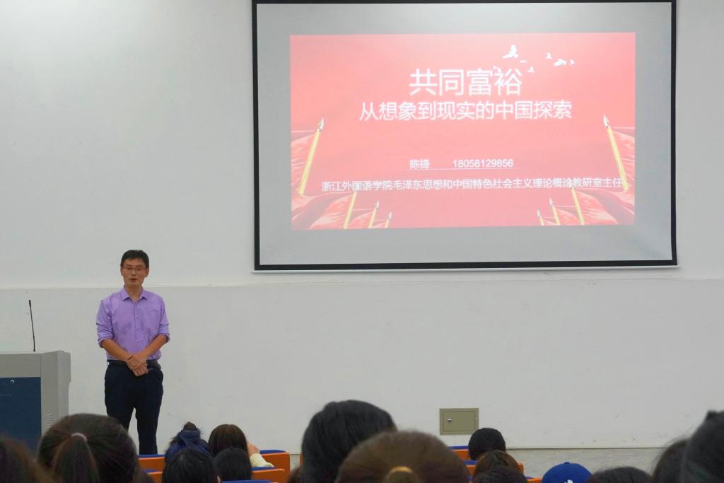 10月14日下午四点,学院在融D108举办“共同富裕”专题讲座,邀请省属高校“共同富裕”宣讲团成员、校毛泽东思想和中国特色社会主义理论概论教研室主任陈锋老师为大一新生作“共同富裕:从想象到现实的中国探索”主题宣讲。本次宣讲是“共同富裕”浙江省高校千场青年理论主题宣讲活动之一,也是学院开展党史学习教育的一项重要内容。