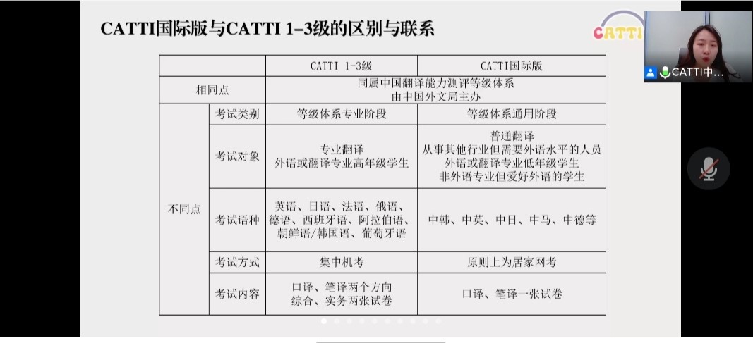 除此之外,王晨阳老师还从CATTI国际版与CATTI1-3级的考试简介和CATTI国际版影响力等方面给同学们分享了CATTI国际版与CATTI1-3级的区别和联系。使韩语系同学们更清楚的了解到CATTI考试。
