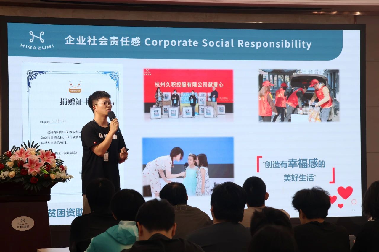 随后,同学们移步至报告厅,进行深度的企业认知与交流。在观看董事长参与拍摄的“我住在这里的理由”系列纪录片后,公司人事经理徐洁代表公司致欢迎辞。公司经营企划室卢成经理介绍了公司概况,他特别提到作为杭州亚运会吉祥物的官方生产商,公司积极服务这一盛事,其倡导的“幸福文化”与之相得益彰。目前,公司产品远销日韩、欧美及东南亚,并与名创优品、腾讯影视等国内知名品牌建立了合作关系。研发部赵静部长随后介绍了产品研发理念,说明久积专注于纺织品开发,围绕幸福、环保、功能性及季节性等关键词开展工作。