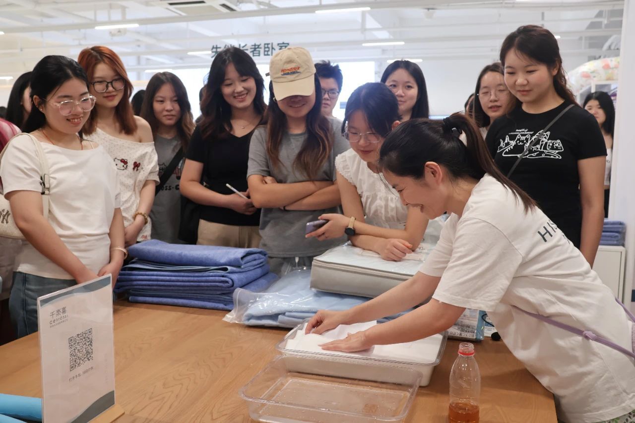 活动伊始,同学们分批参观了公司展厅。公司特别介绍了远销海外的熊猫联名产品,帮助同学们了解到融合中国元素的设计在海外市场的受欢迎程度。在公司二楼的功能产品体验区,工作人员介绍了“记忆花园”项目——为阿尔茨海默症患者定制带有个人记忆符号的宠物玩偶和植物主题制品,还展示了床垫吸湿除臭功能的测试过程,其严谨态度体现出企业对品质的不懈追求和对功能验证的高度重视。