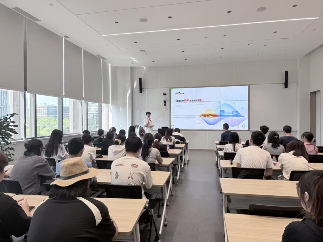 在大华股份工作人员的引导下,师生们首先参观了企业展厅。展厅讲解员详细介绍了大华股份的全球化战略布局、以创新为核心驱动力的竞争优势,重点展示了公司在智慧技术领域的领先实力及广泛应用场景。