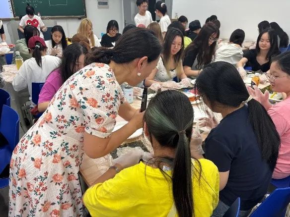 在动手实践环节,同学们分组协作,兴致勃勃地开始制作属于自己的紫菜包饭卷。老师们也穿梭于各小组之间,热情参与到同学们的实践中,不时给予耐心指导,与同学们亲切交流制作心得,共同探讨韩国饮食文化的特点与乐趣。亲手卷制的过程中,同学们不仅学习了实用的烹饪技巧,更深刻感受到了韩国饮食文化的独特魅力与精致之处。