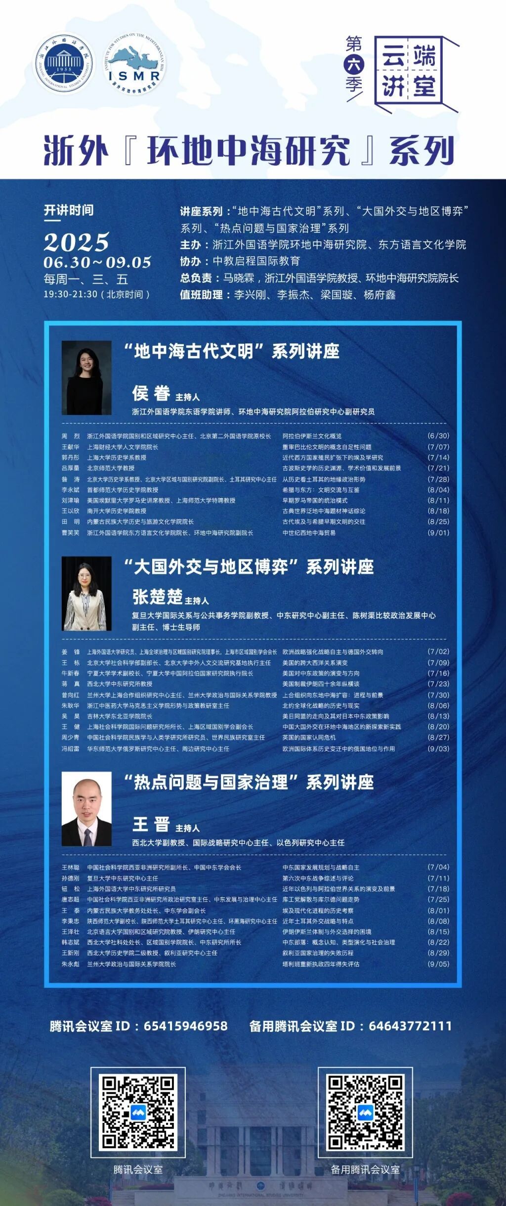9月5日,浙外“环地中海研究”系列云端大讲堂第六季圆满收官。自6月30日启动以来,本季大讲堂历时两个多月,于每周一三五晚间7:30至9:30准时开讲,共举办讲座30场,为广大师生和学术爱好者带来了一场持续深入的思想盛宴。