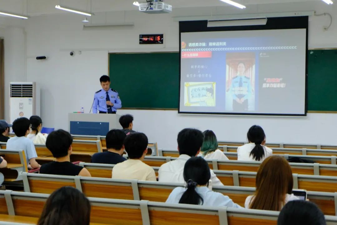讲座中,刘云腾警官以派出所职能切入,结合真实案例,围绕电信诈骗防范、个人安全防护、社会安全三大重点领域展开讲解。针对高发的电信诈骗,刘警官详细剖析了诱惑、恐吓、帮助类三类诈骗手段,明确指出“要求转账、索要验证码、发送逮捕令”等均为诈骗信号,提醒同学们对自称公检法的来电务必与官方核实。同时,还科普了帮助信息网络犯罪活动罪,警示大家警惕骗子话术,提升辨别能力。