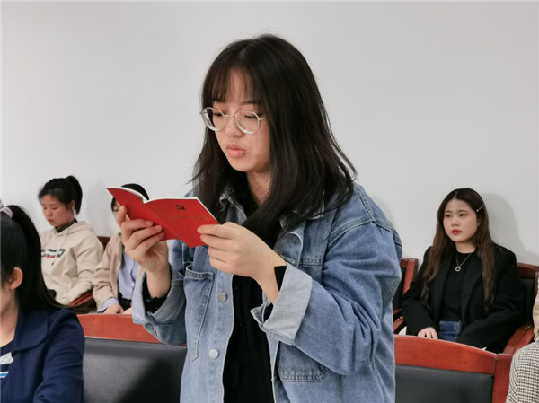 学生第一党支部书记丁彩瑶老师首先对学生党员关于应知应会、浙江三地建设、三严三实、两学一做等内容进行了抽查,并查看大家学习强国平台和学习记录本的学习情况,同时带领大家进一步了解应知应会、浙江三地建设、三严三实、“两学一做”以及《中国共产党章程》里的重要内容。作为浙江省党建样板支部,丁老师也在会上分享了学生第一党支部工作经验,介绍了样板支部的建设情况。