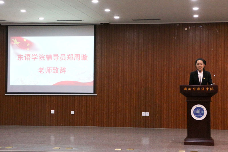 其后,一曲雄壮的国歌完毕,第一次全体会议正式拉开了帷幕。会议伊始,东语学院辅导员郑周璇首先致辞,她总结了学院成立以来团学组织开展各项活动的收获,对东语学子表示了认可,给予了鼓励,并预祝大会圆满成功。随后,西语学院学生会主席章译文作为兄弟学院团学干部代表向肉漫屋