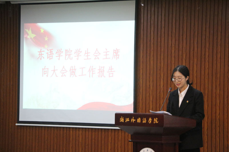 之后,在郑周璇老师的团委工作报告中,总结了过去一年东语学院团委在各方面的傲人成绩,并阐述了今后的工作规划。而学生会成员汪雨欣的学生会工作报告则对学生会至今的工作成果作了总结,展望未来的同时表达了希望全体成员共同进步的期盼。