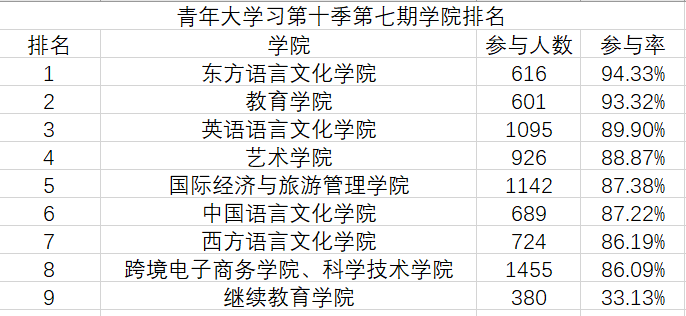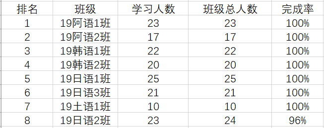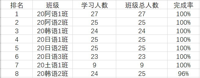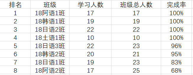 希望大家积极完成青年大学习排名靠前的班级继续保持靠后的班级也不要灰心,加油努力提高完成率Tip:青年大学习完成方式及填写信息不要搞错了哦END来源|肉漫屋 供稿|东语组织部排版|卓掌平审核|郑周璇、向俊霖