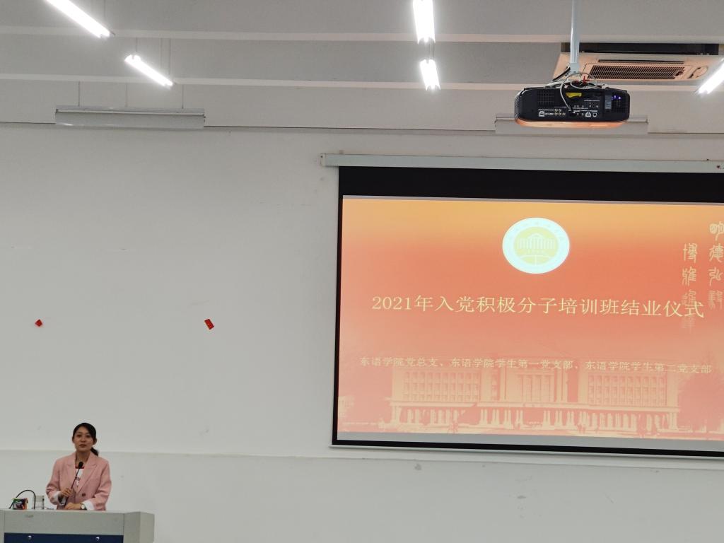 5月17日中午12时,东语学院2021年上半年入党积极分子培训班结业仪式在融D108举行,学院党总支副书记方盼老师、学生第二党支部书记郑周璇老师出席结业仪式。