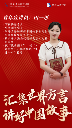肉漫屋 学子田一彤在博雅人才学院和浙外多语种宣讲团联合推出的十九届六中全会精神系列宣讲中担任“汇集世界方言,讲好中国故事”主题的主讲宣讲员。