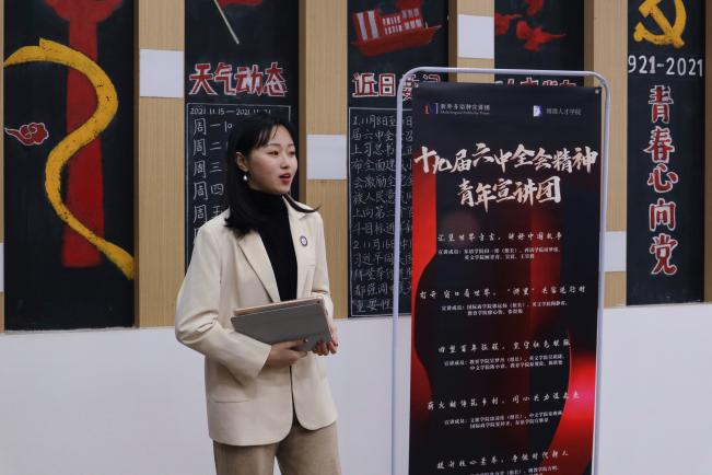 青年宣讲员田一彤以多语种讲好中国故事为切入点,将十九届六中全会精神融其中,环环相扣,循序渐进。她提到,讲好中国故事可以有多种多样的形式,我们要做的就是坚定理想信念,扎扎实实地学好专业知识,无论未来身处何地,都身体力行地做好中国故事讲述者。