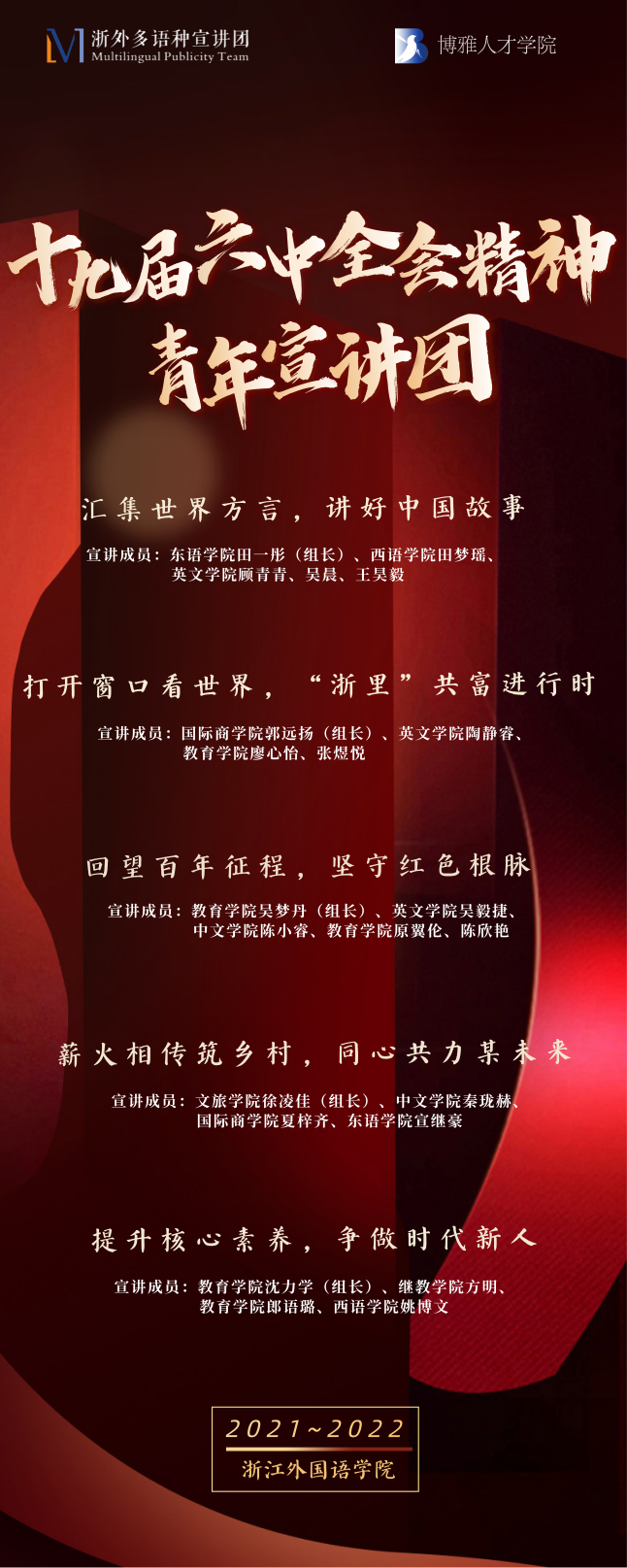 本系列宣讲共有五个主题,跟随宣讲团的步伐,青年宣讲员们已经在国际商学院创业学院、教育学院进行了两场、五个主题不同形式的宣讲,获得了两个学院师生的一致好评。下学期还将去到更多学院,敬请期待吧······