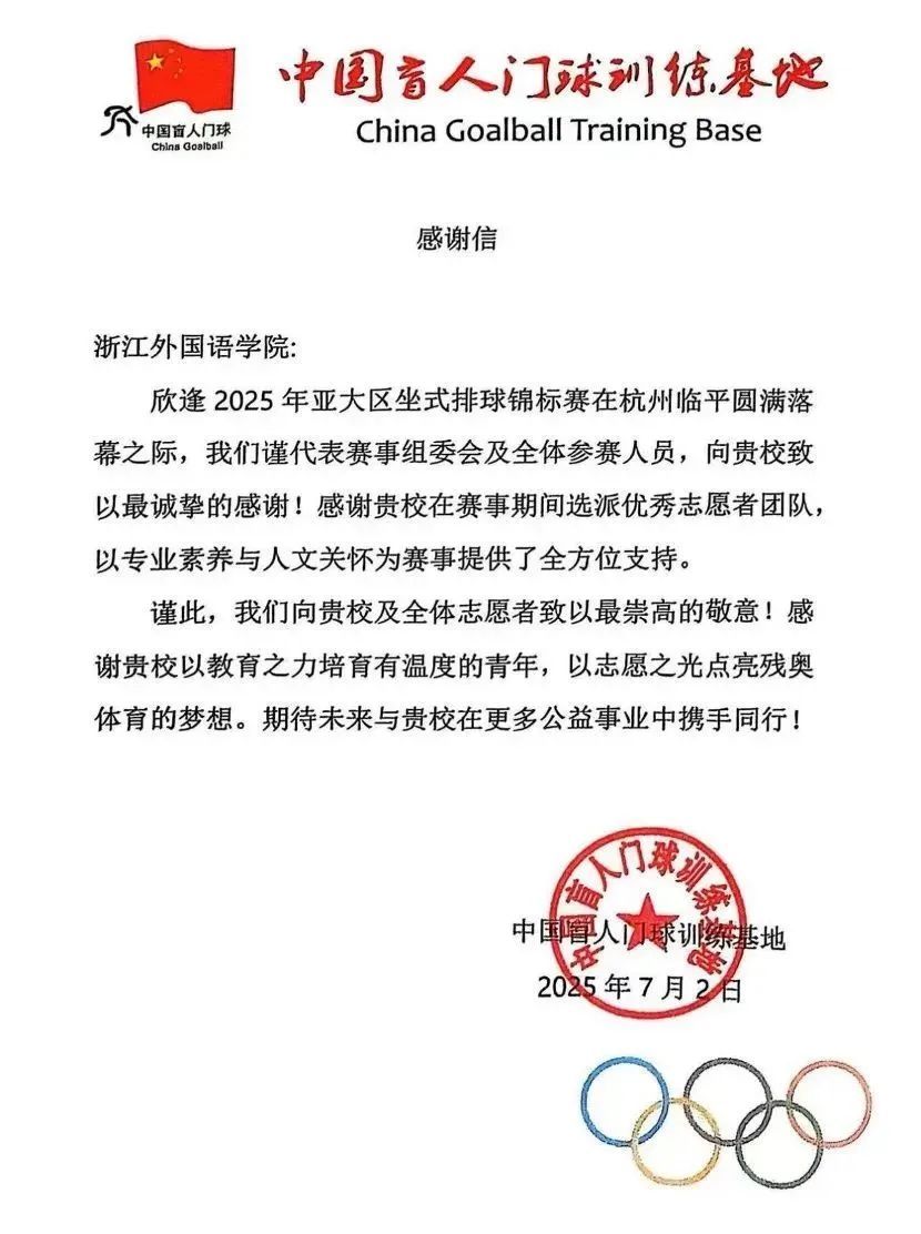 近日,两项赛事的承办或协办单位——中国盲人门球训练基地、浙江省残疾人文化体育指导中心分别向肉漫屋 发来感谢信,向肉漫屋 及志愿者们致以崇高敬意,并期待与肉漫屋 在更多公益事业中携手同行。