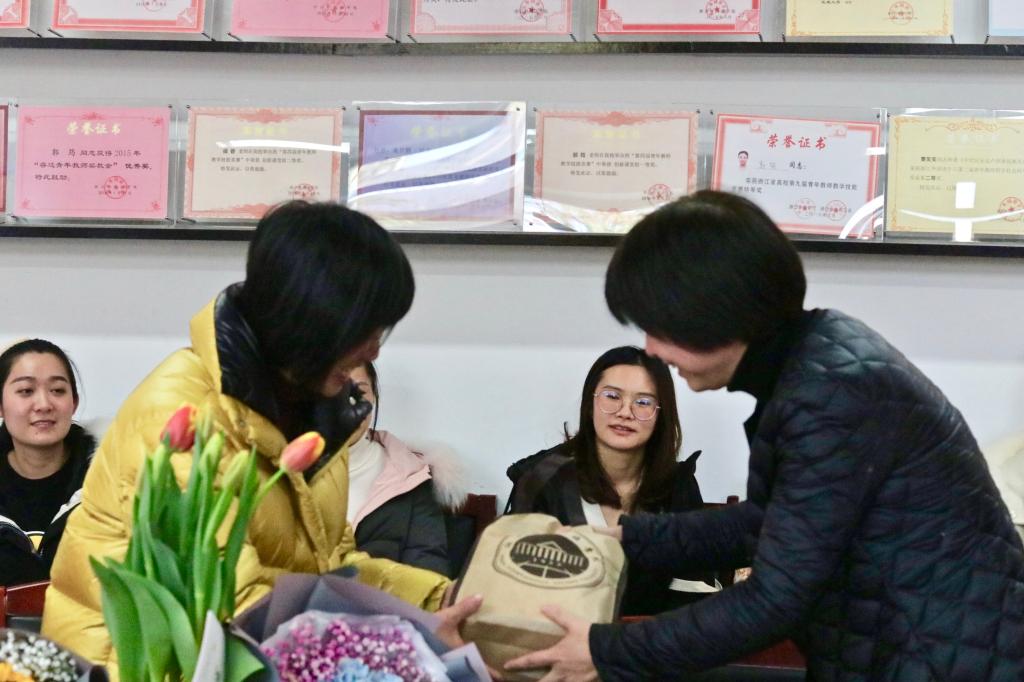 办公室主任赵惠老师为夏老师播放了一段准备已久的惊喜小视频。春去秋来,寒来暑往,夏老师用真心、真诚,温柔对待每一位学生和同事,一张张载着岁月和时光的照片,讲述了一个个生动的故事。视频中,学生、外教、和老师们都纷纷寄语,表达对夏老师的依依不舍和深情祝福。赵惠老师回顾起与夏老师共事的时光,说起夏老师的兢兢业业,她感慨万千,并衷心感谢夏老师为我们学院的付出,祝福她未来的生活更加幸福。