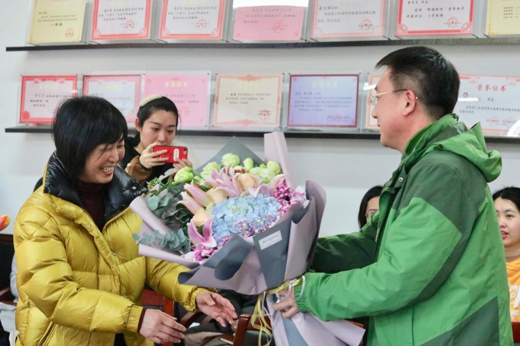 阿语系郭筠老师也一度哽咽,她回忆学院初创时与夏老师一起带着学生参加比赛的点点滴滴,并代表全体阿语系老师为夏老师送上郁金香,祝愿夏老师带着日语系的优雅,像郁金香一般阳光、温暖,感染身边每一个人。