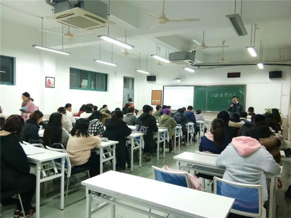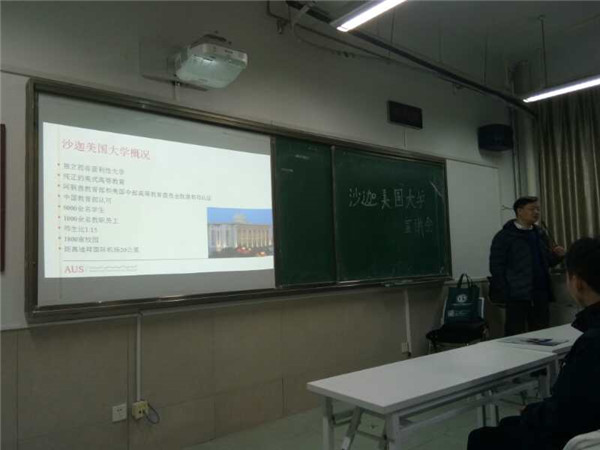 在会上,徐教授首先播放了沙迦美国大学的宣传片,然后从学校概况、专业设置、校园环境、奖学金情况以及申请项目的程序等几个方面,向同学们介绍沙迦美国大学合作项目以及硕士和博士招生要求。在场的同学认真聆听,仔细地进行记录。在提问环节中,同学们提出了关于本科生交流项目的问题,得到了徐教授的详细解答。