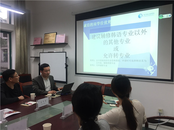 金海救副院长首先介绍了东语学院各专业概况,介绍了各专业的发展历程及相应的师资队伍。并详细阐明了2+2中外合作办学的构想,提出双方在学生交流、实地实习、教师交换、青年教师培养等方面的相关合作设想。接着,韩国诚信女子大学代表积极肯定两校友好合作历程,双方就2+2双学位合作办学项目、本硕5年连读项目、假期短期合作留学项目等交流事宜展开深入探讨。最后,金日组长重点介绍诚信女大的学校状况,对留学相关信息也做出了详细说明和答疑。