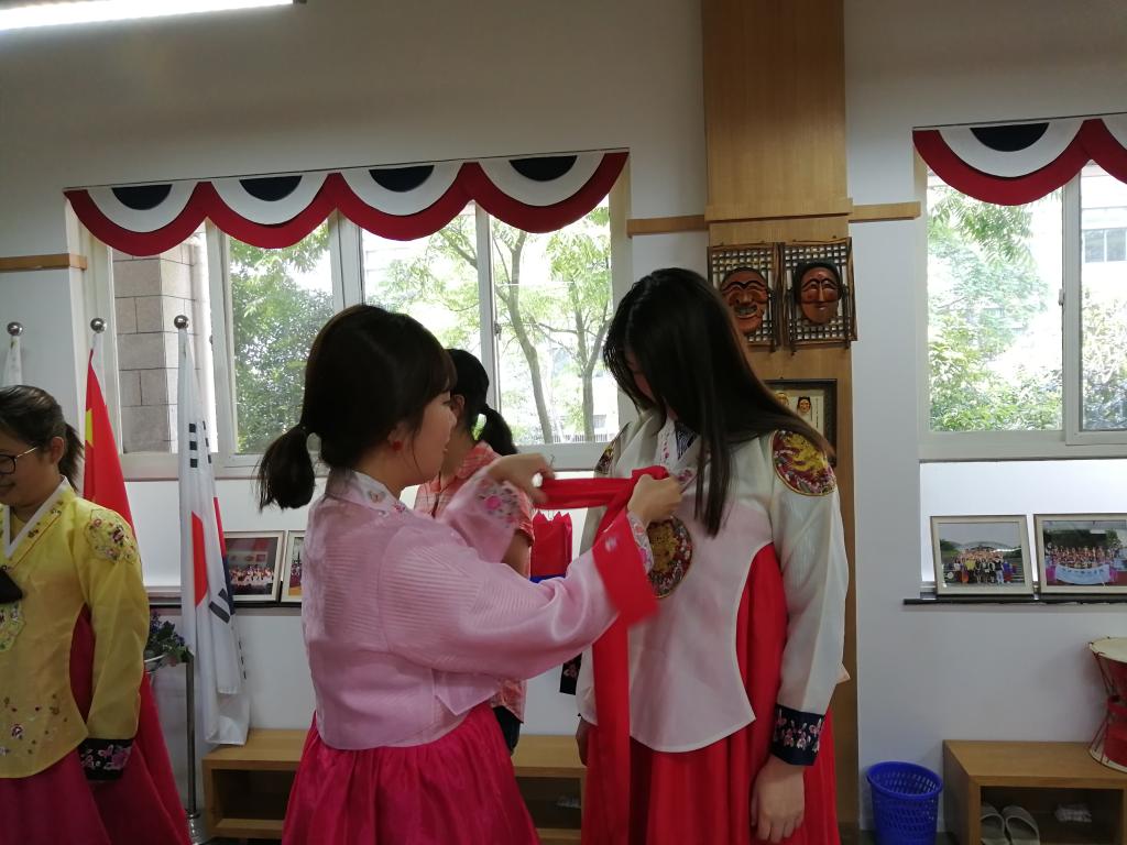 5月22日至5月23日,东语学院韩语系金秀衍老师为不同专业的同学们在韩语系文化体验室带来了有趣的“韩国服饰”文化课。课堂上老师讲解了男女服饰的不同点,韩服的作用,穿韩服的步骤等,最后大家穿上韩服亲身体验。