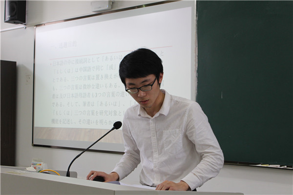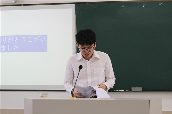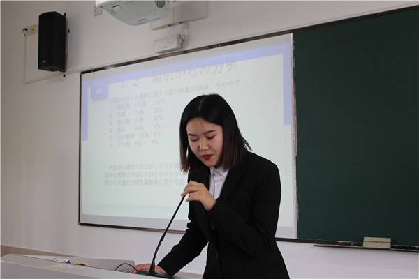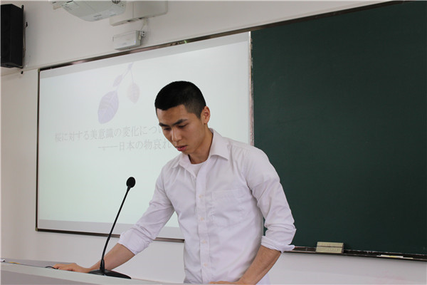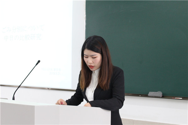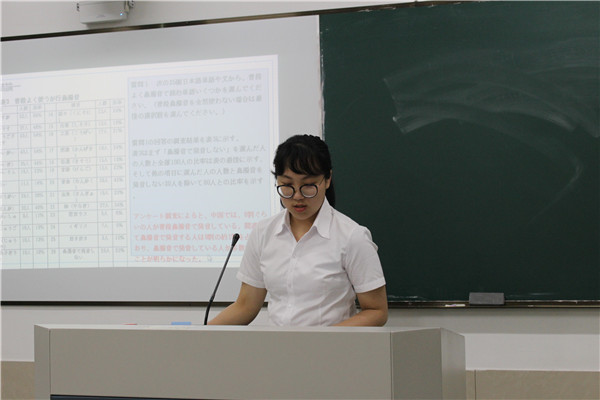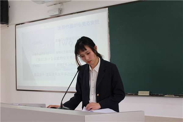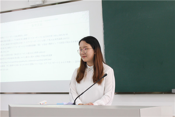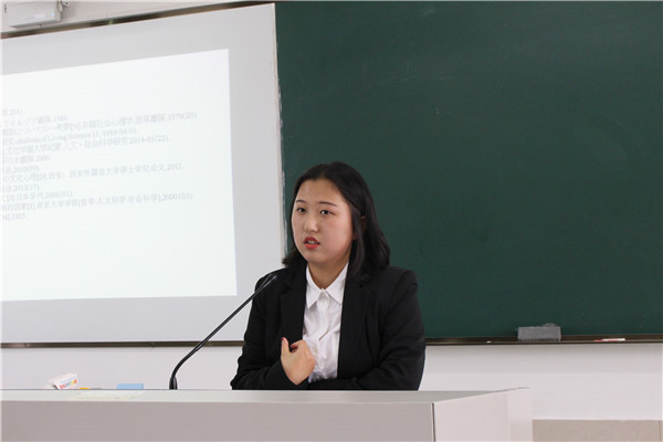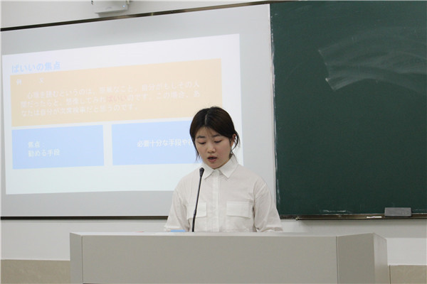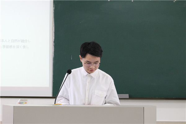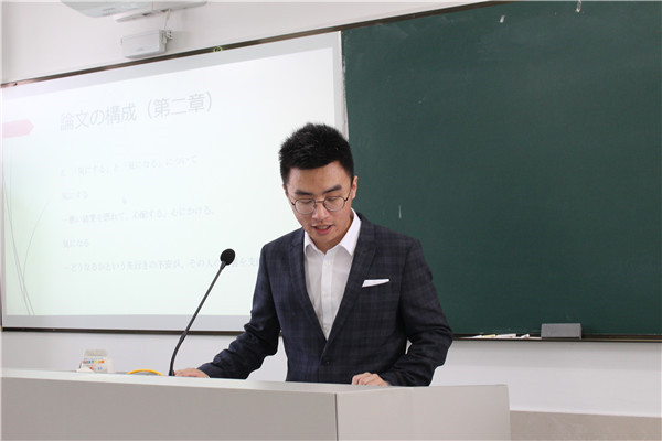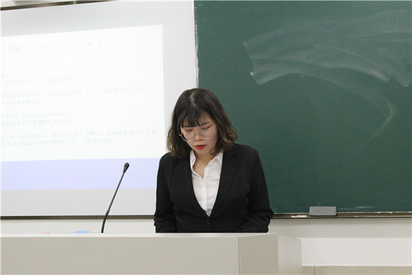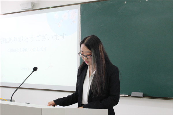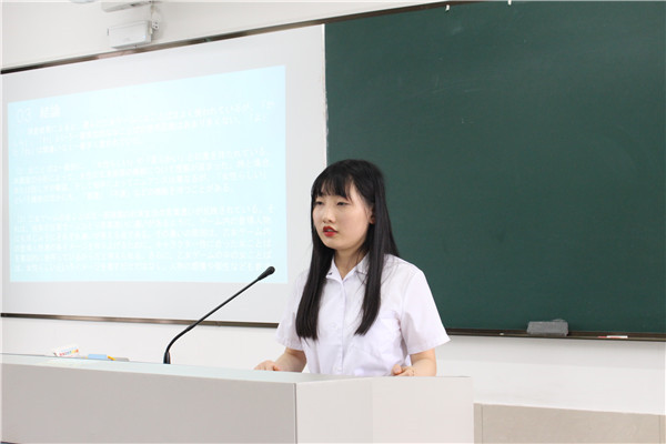 抽签结束后,各位同学按顺序上台答辩。答辩分为现场展示和教师提问两个环节,其中现场展示为四分钟,教师提问为两分钟,答辩中学生必须用日语表达。答辩现场,答辩人围绕自己的论文主题,从研究目的、研究内容、研究方法、论文构成等方面,对自己的毕业论文进行了汇报,并会在最后给出详细的参考文献。