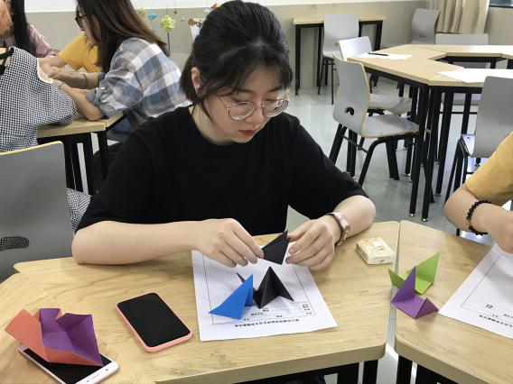 在东语学院的文化周中,学院为17级的各位同学们安排并开展了丰富多彩的活动。其中日语系的老师与学生们,为大家带来了日本游艺——日本折纸。