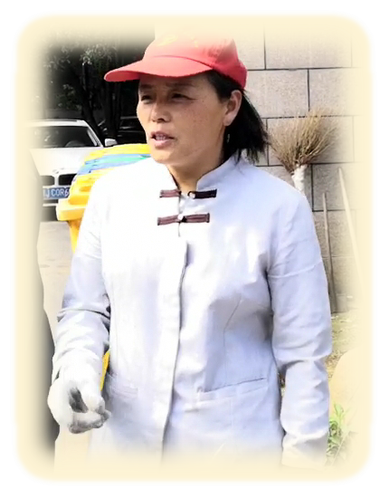 倪根凤阿姨已任职四年,负责望院大门口到西门的主干道室外保洁的工作。