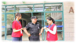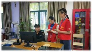 接下来,我们另一批志愿者采访了保卫处四十五岁的潘小平叔叔,他与浙外已经相处了一年的时间。他的主要工作是负责查看监控,通过一块块屏幕坚守着每一处公共场所。他说这份工作“是在学习一门技术”,一门守护着校园平安的技术。他与同学们友好相处,帮助同学解决遗失物品等大大小小的问题,同学们总是被他的尽职尽责所感动。他希望同学们在学校里要多注意交通安全,身体健康是最重要的。