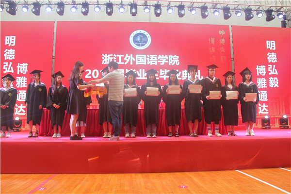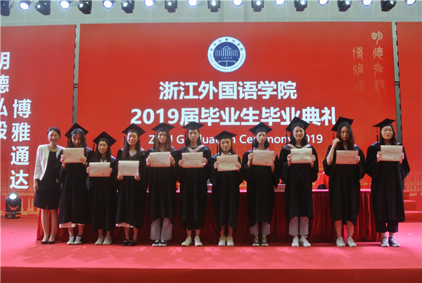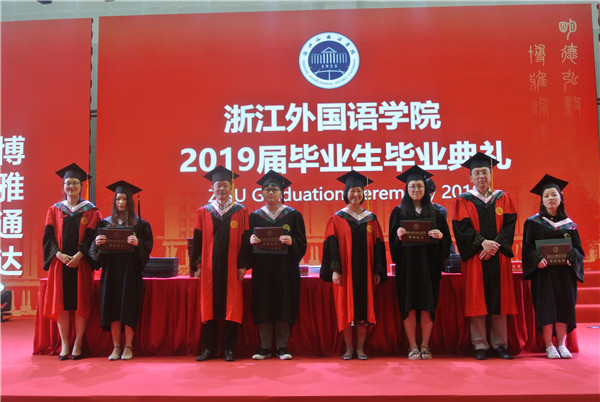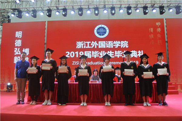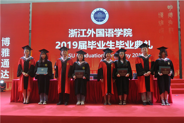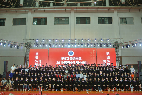 在行健馆举行2019届毕业生学位授予仪式。学院党总支书记王永青、副院长金海救、副院长曹笑笑、日语专业夏菊芬教授、土耳其语专业沈志兴教授、党总支副书记屠立达、各语系主任、任课教师、辅导员与19届全体139名毕业生参与了仪式。仪式由屠立达老师主持。