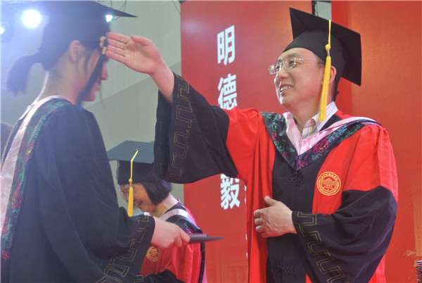 随后,毕业生们依次有序走上主席台,由夏菊芬、沈志兴、金海救、曹笑笑四位教授为他们颁发学位证书并行拨穗礼。