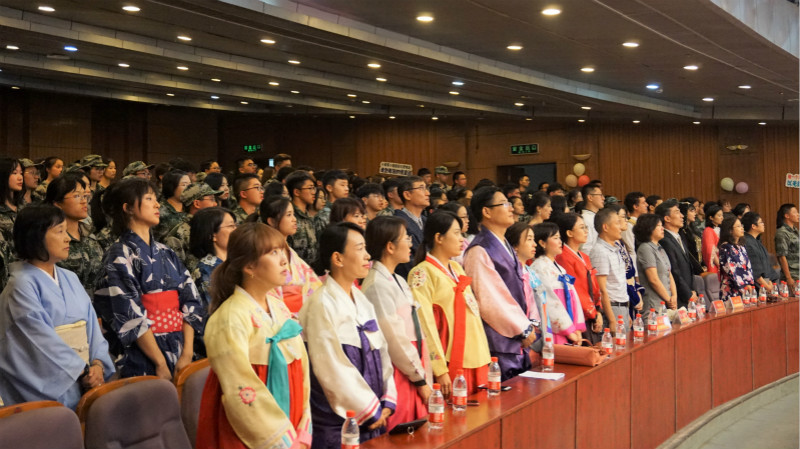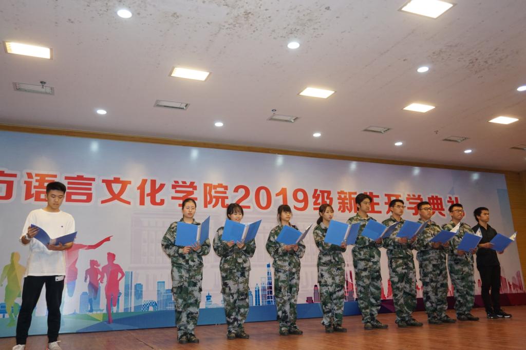 首先,全员师生齐唱国歌。唱毕,日语系新生周子涵同学作为新生代表上台发言,表达了对大学四年学习生活充满的期待。