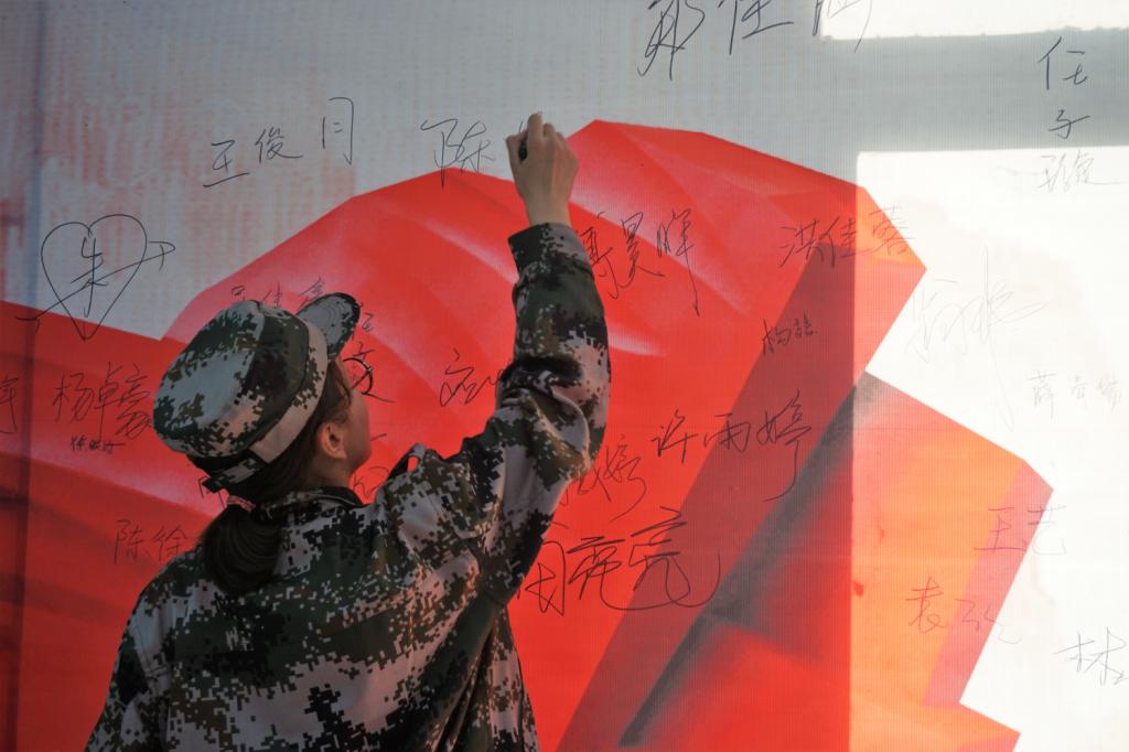 新生典礼开始前,新生们纷纷在大堂前的喷绘板上签上自己的名字,象征着自己正式成为东语大家庭的一份子。