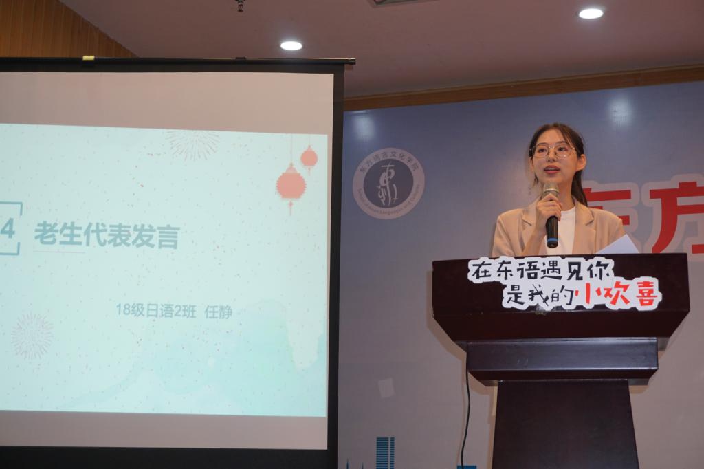 随后,由老生代表18级日语2班任静发言,分享了大一的生活学习经验。