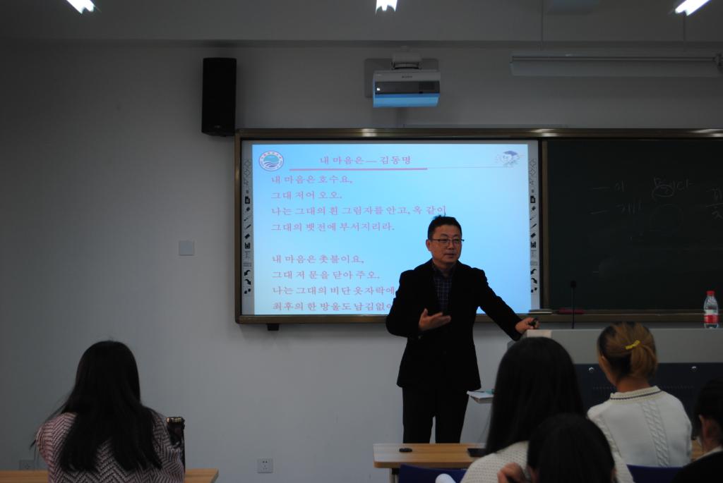 此次讲座,李光在教授围绕“韩国流行诗歌赏析”这一主题,为同学们阐释了文学的重要性及文学作品的必要性,并通过中韩诗歌的对比赏析帮助同学们更好地了解诗歌审美标准随时代的变化,此外还提出:“我们要想学好韩国文学就必须要清楚中国文学。”通过李光在教授的讲解同学们了解到,在韩国地铁的站台或防护玻璃墙上很容易发现一些简短的韩国诗歌作品。于韩国,诗歌作品不是可望而不可即的高雅艺术,这些富有哲性思维并脸炙人口的诗歌名句被韩国很多民众所喜爱,是一种贴近人民生活的艺术。在韩国诗歌作品的鉴赏过程中我们可以重温中国的经典诗句,理解并掌握这些诗句的经典魅力及其在当今生活中的意义和作用。