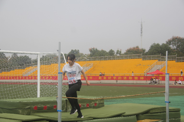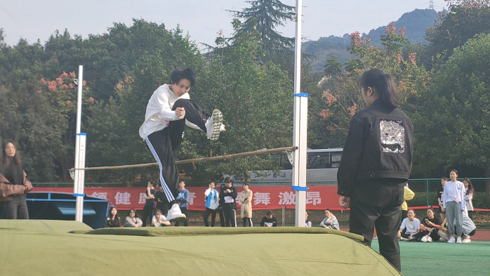 一阵助跑后,飞跃起身,轻盈的身体跨过了竹竿,柔软的身体在空中画出一道彩虹的弧度。