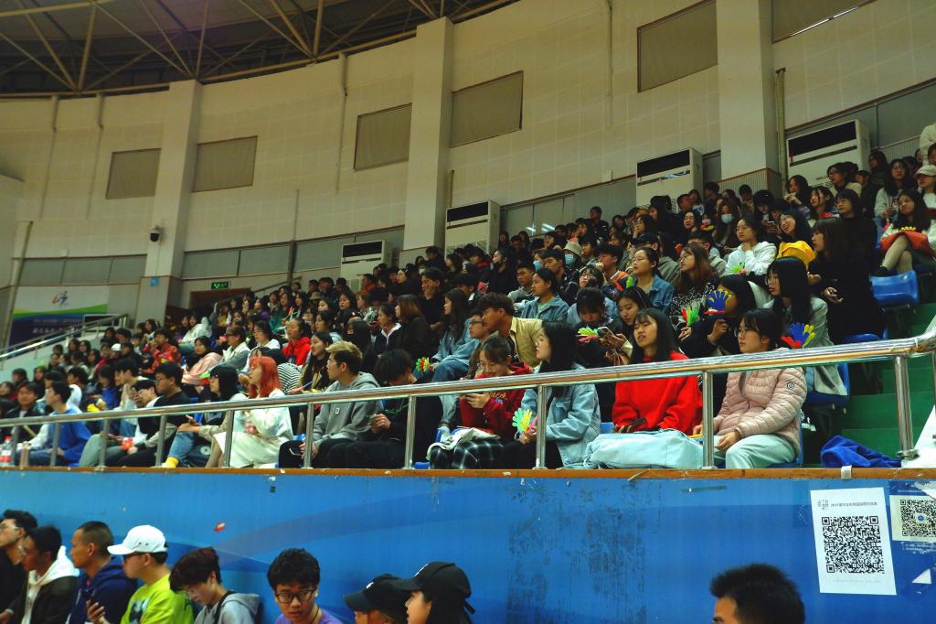 观众们振臂高呼,欢呼尖叫势如破竹,一阵阵“东教加油!”响彻篮球馆