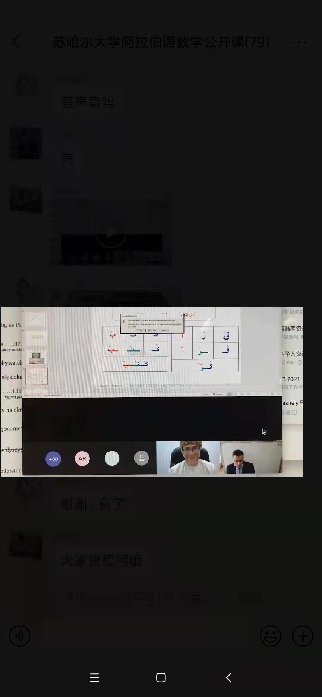 阿语系与阿曼苏哈尔大学成功举办了为期三天的在线公开课活动。此次活动由苏哈尔大学发起,授课内容围绕阿语的总体介绍、阿语基础语法知识以及如何学好阿语等方面展开。课上,来自苏哈尔大学的阿拉伯教师亲自指导发音,并与阿语系同学关于阿拉伯国家、阿拉伯语学习等问题进行了热烈的沟通与互动。