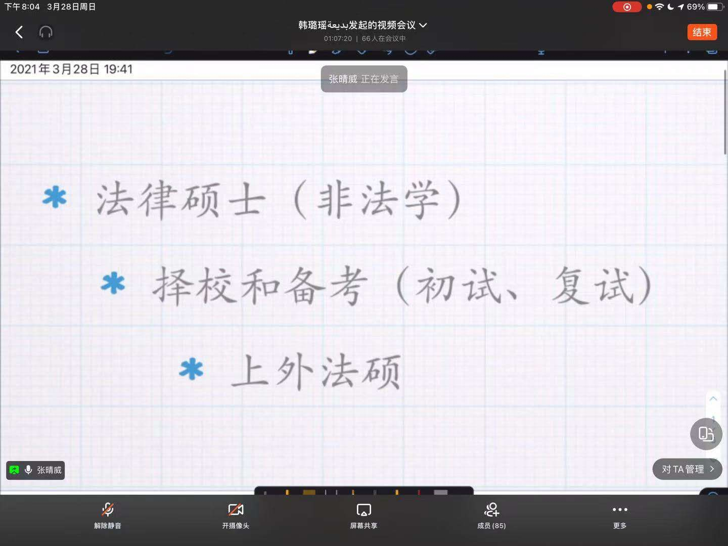 接着由跨考上外法学的张晴威学姐为学弟学妹们介绍上外法学(阿拉伯语)方向的相关情况,为打算跨考其他学科的同学提供了详细的备考经验,同时也就上外阿语方向的法学研究生今后的工作方向做出了一些介绍。