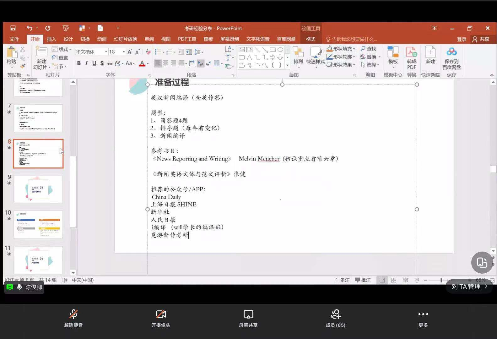 接下来是陈俊卿学姐,她分享了自己的准备过程和经验教训,以及对上外阿拉伯语可跨考的专业作出了补充,同时她强调:英语和阿拉伯语都非常重要,既要注重平时积累,多看一些有关英语新闻的公众号内容,也要每天坚持背单词,练习历年真题。
