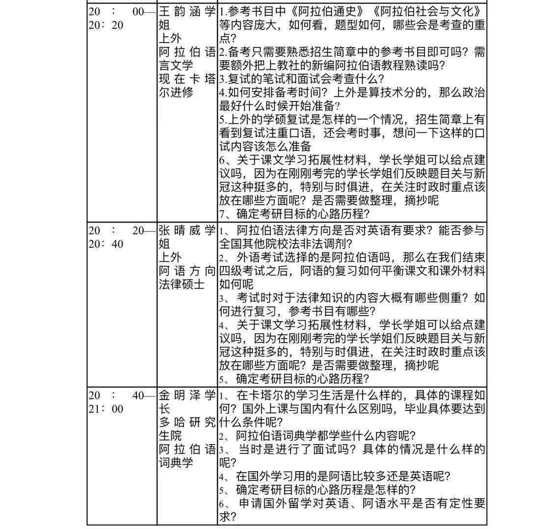 阿语系邀请了历届考取北外、上外等名校的校友们来为同学们进行考研宣讲,她们分别是在2014年考取北京外国语大学阿拉伯语口译方向硕士的王欣学姐,2015年考取上海外国语大学阿拉伯语语言文学硕士的王韵涵学姐以及同年考取上海外国语大学法学(阿拉伯语方向)硕士的张晴威学姐,2019年考取北京第二外国语学院阿拉伯语口译方向的朱佳璐学姐以及同年考取多哈研究生院的阿拉伯语语言词典学硕士的金明泽学长,2020年考取上海外国语大学多语种新闻方向的陈俊卿学姐。