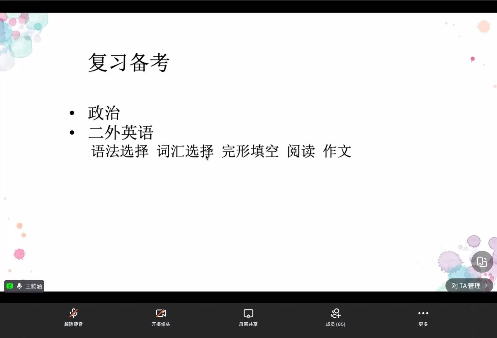 考研宣讲会的最后还设置了答疑环节,同学们提出了自己的疑问,校友们进行线上咨询答疑,到此考研线上宣讲便拉下了帷幕,宣讲活动圆满结束。