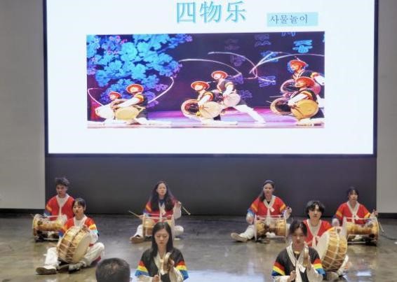 21韩语1班带来的四物乐表演,在演奏时搭配人声的唱和,来展现人与天地之间的和谐关系,形成了一种绝妙的协和,是朝鲜族文化多样性的生动展示,是朝鲜人民的历史瑰宝。