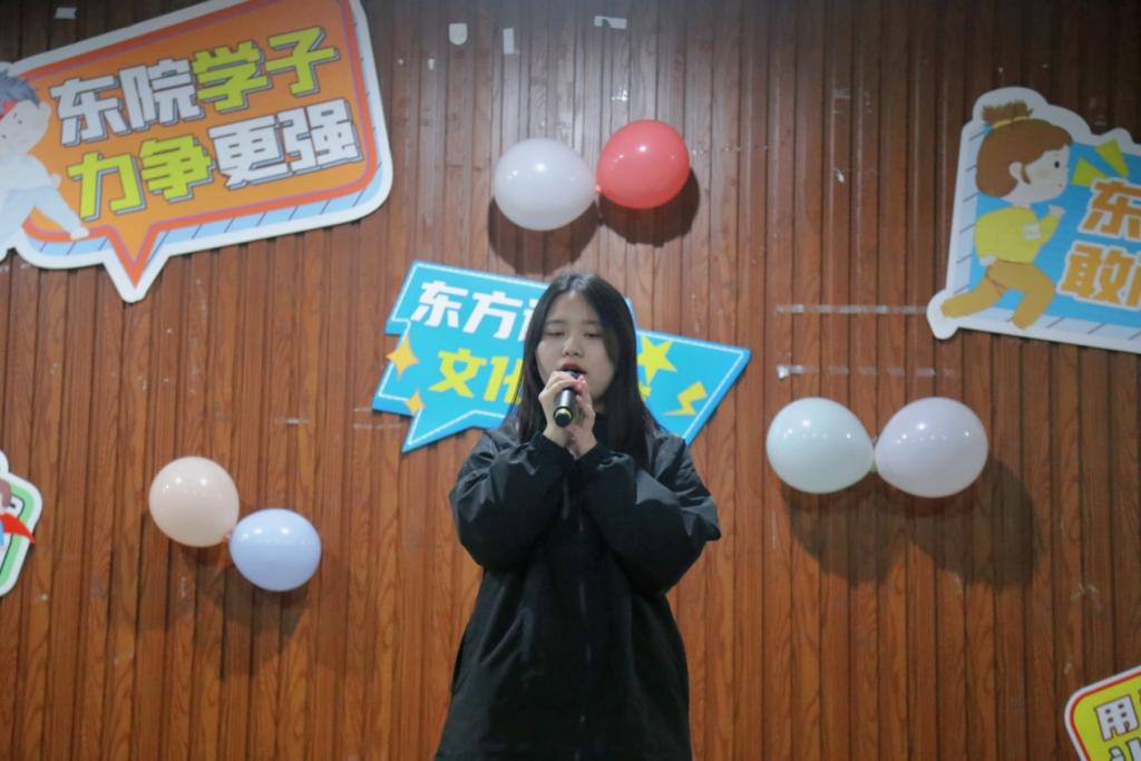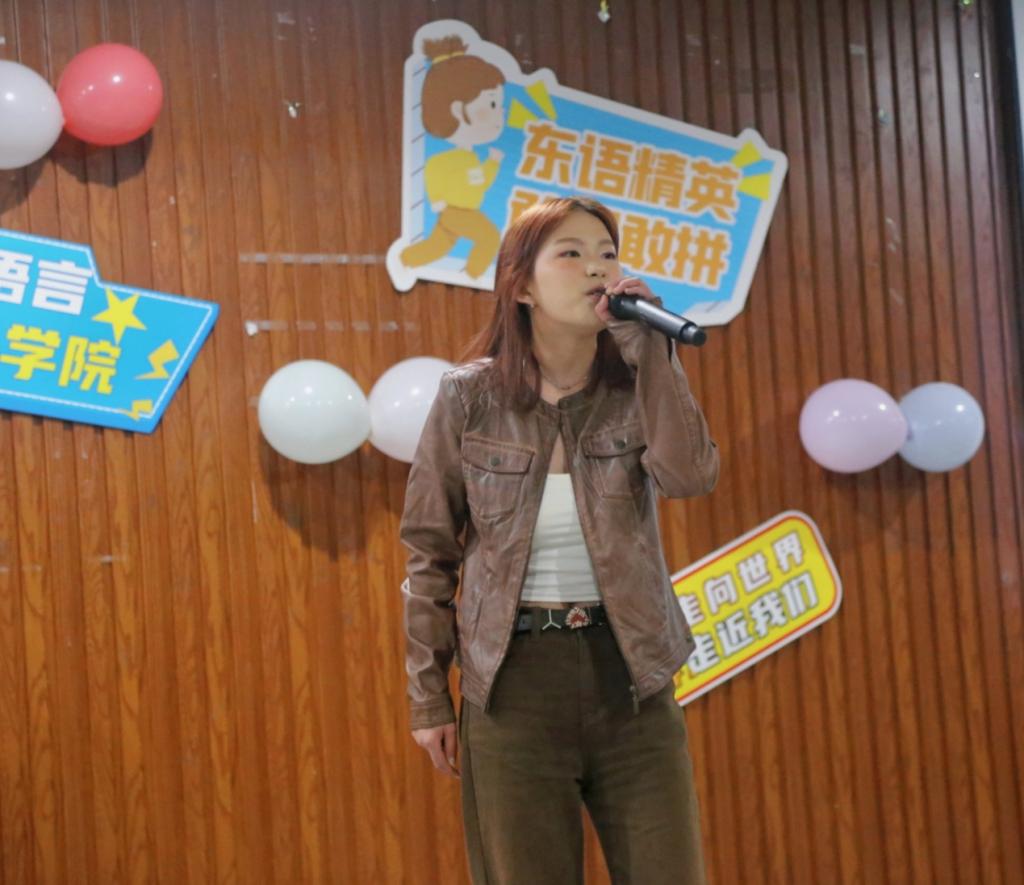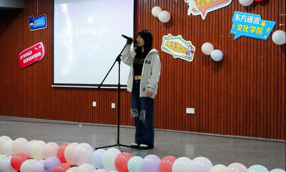 来自22日语2班的顾佳,她持着“乐动我心,乘风飞扬”的宣言登上舞台,用充满感情的歌声,以一首《Letting GO》,让掌声、欢呼声瞬间点燃了全场。