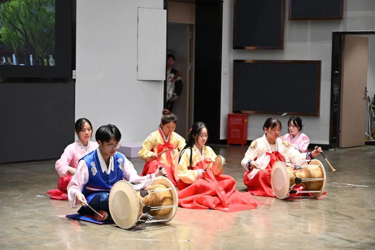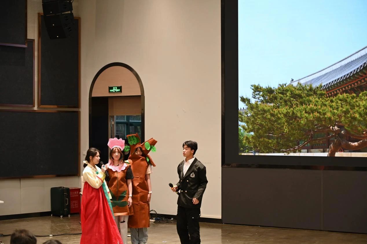 23韩语2班的情景剧表演《我离古代很远吗》。通过穿越的剧情,带领我们感受了时光流转所牵引的文化变迁。不论是古代的鼓乐表演还是现在流行的K-POP表演,都展现了浓厚的韩国风情。