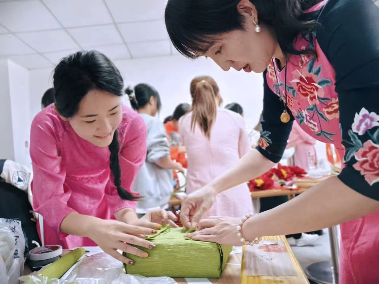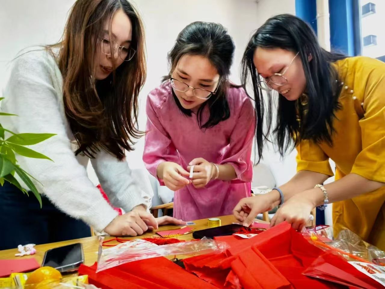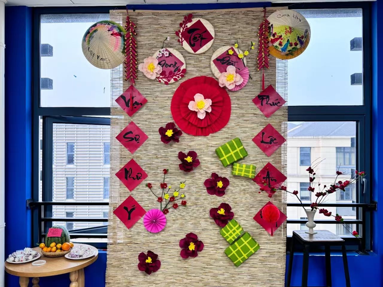 越南的春节传统与中国春节的传统大同反映,越南家庭在春节也有张贴对联悬挂灯笼的习俗,以表达对新年的美好祝福。同学们分成若干小组分别进行了挂竹席,贴春联,制作纸花,模拟包年粽以及用扭扭棒制作桃花、梅花等习俗体验。欢声笑语之中,同学们更加深入地了解了越南的传统文化、节日习俗等,还学习了不少日常用语和节日祝福语。